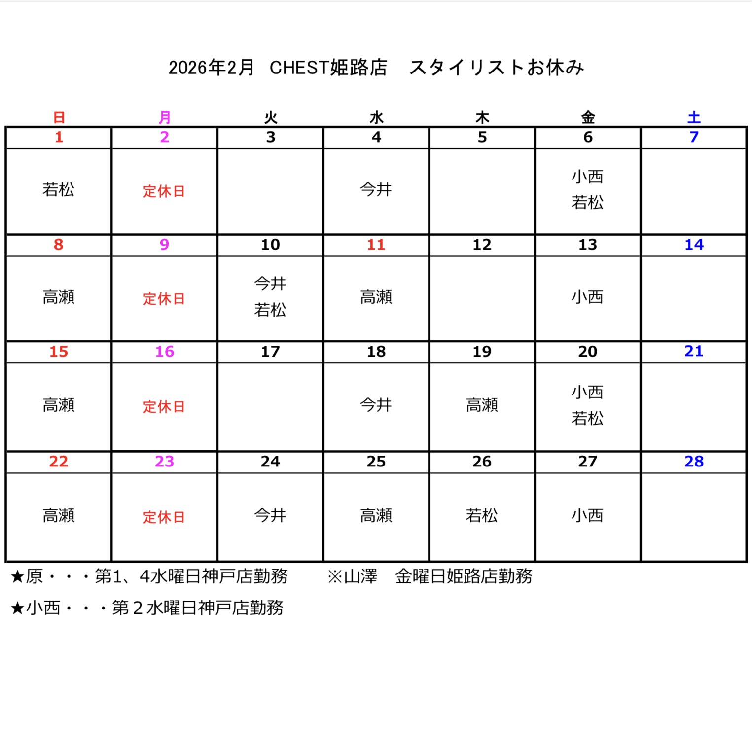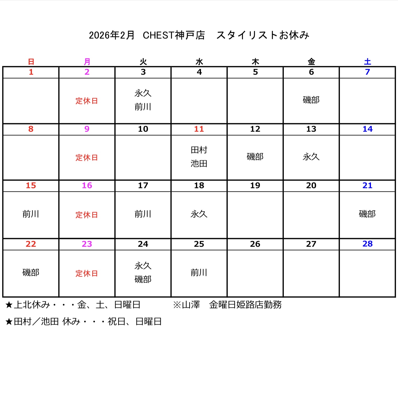 CHEST神戸店、CHEST姫路店の2月のお休みをお知らせいたします。