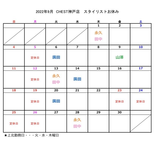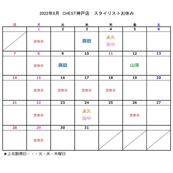 各スタイリストの個人休に関しましては下画像をご参照下さいませ。