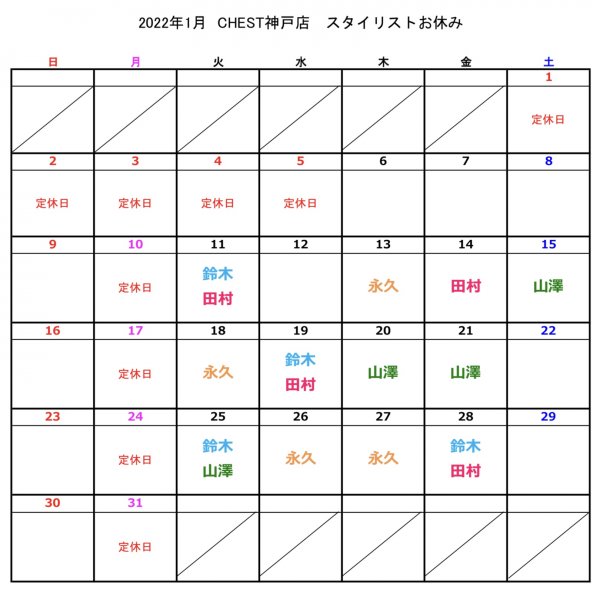 1月神戸店スタイリストのお休み