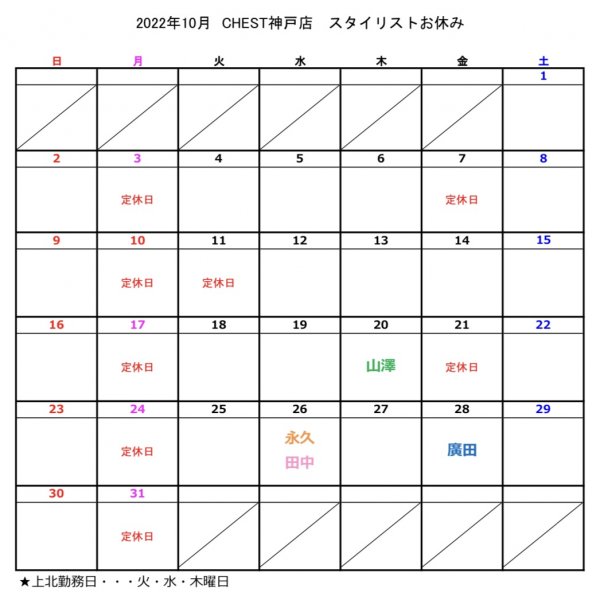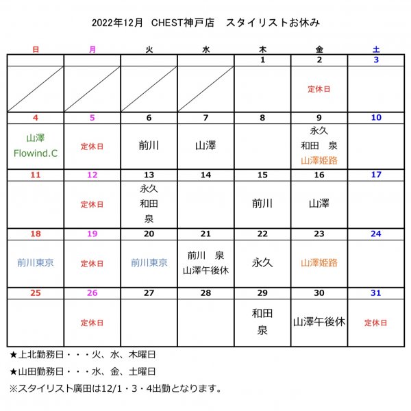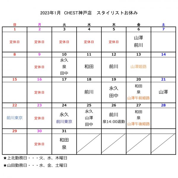 各スタイリストの個人休に関しましては下画像をご参照下さいませ。