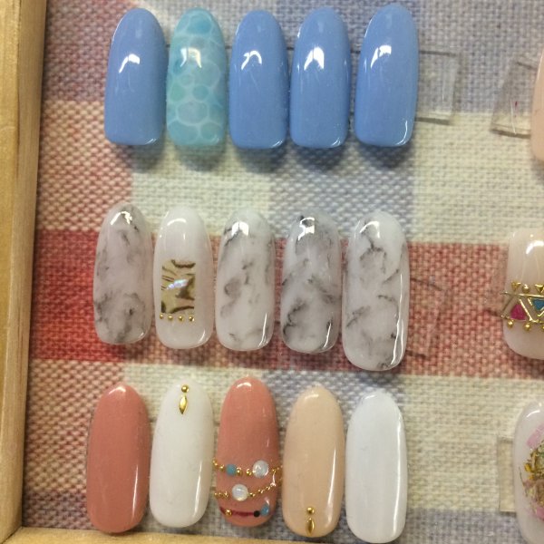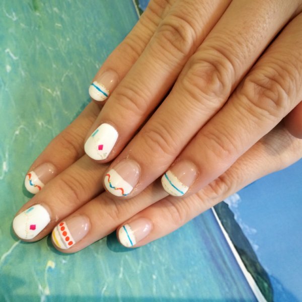 白の変形フレンチをベースにブルーやオレンジで波模様を入れたりと