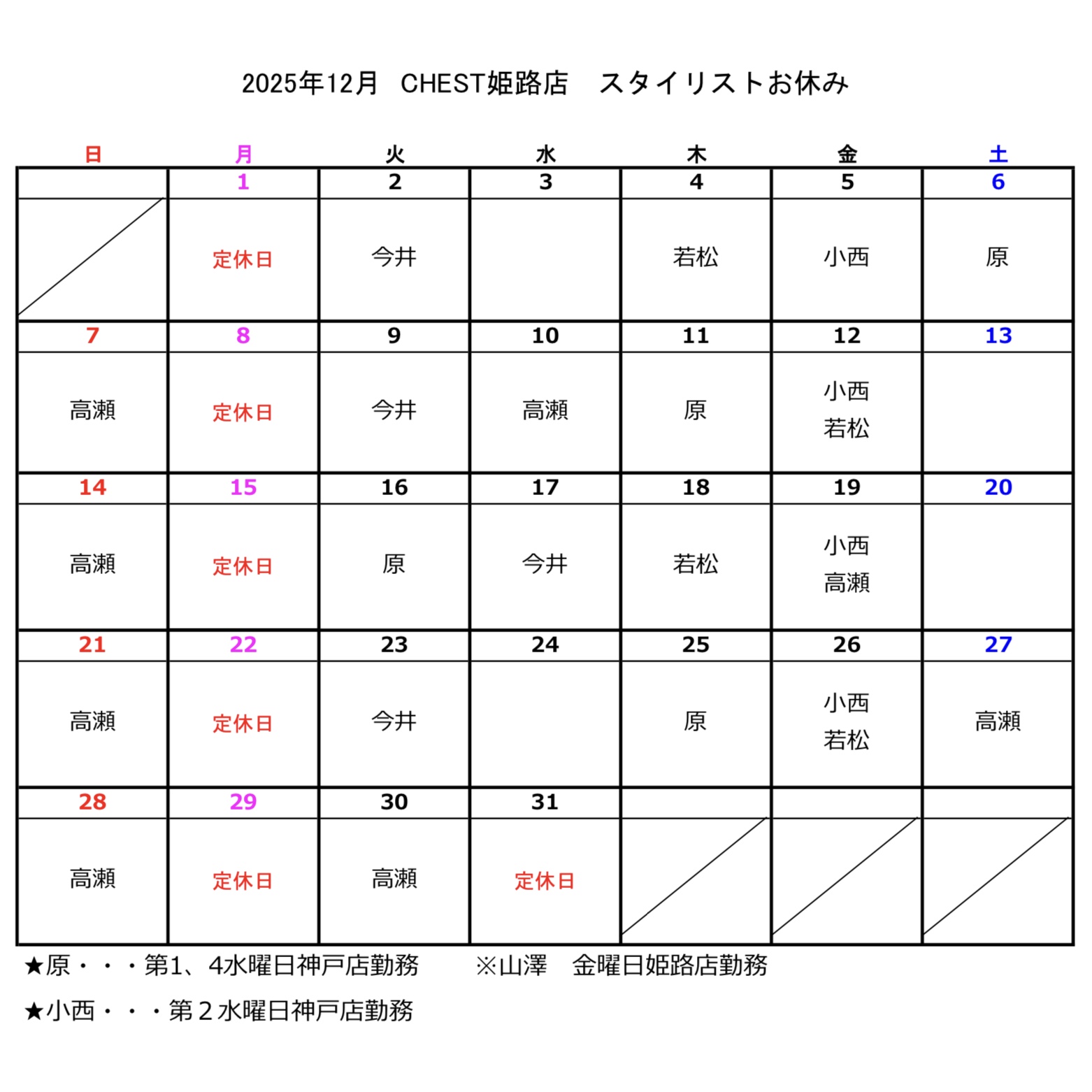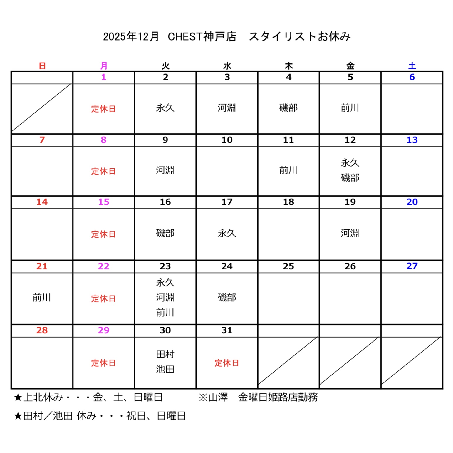 【CHEST神戸店・姫路店】12月のお休み