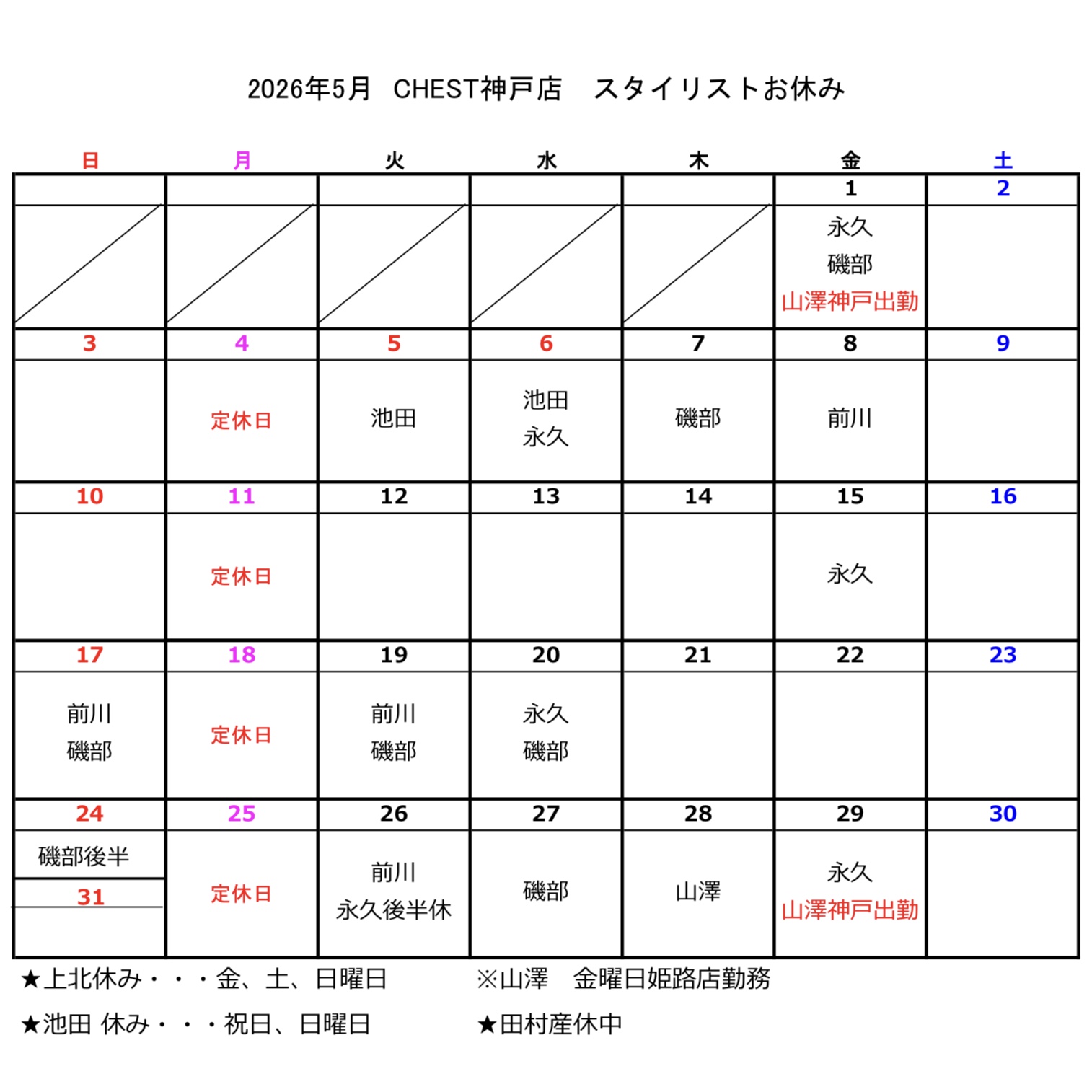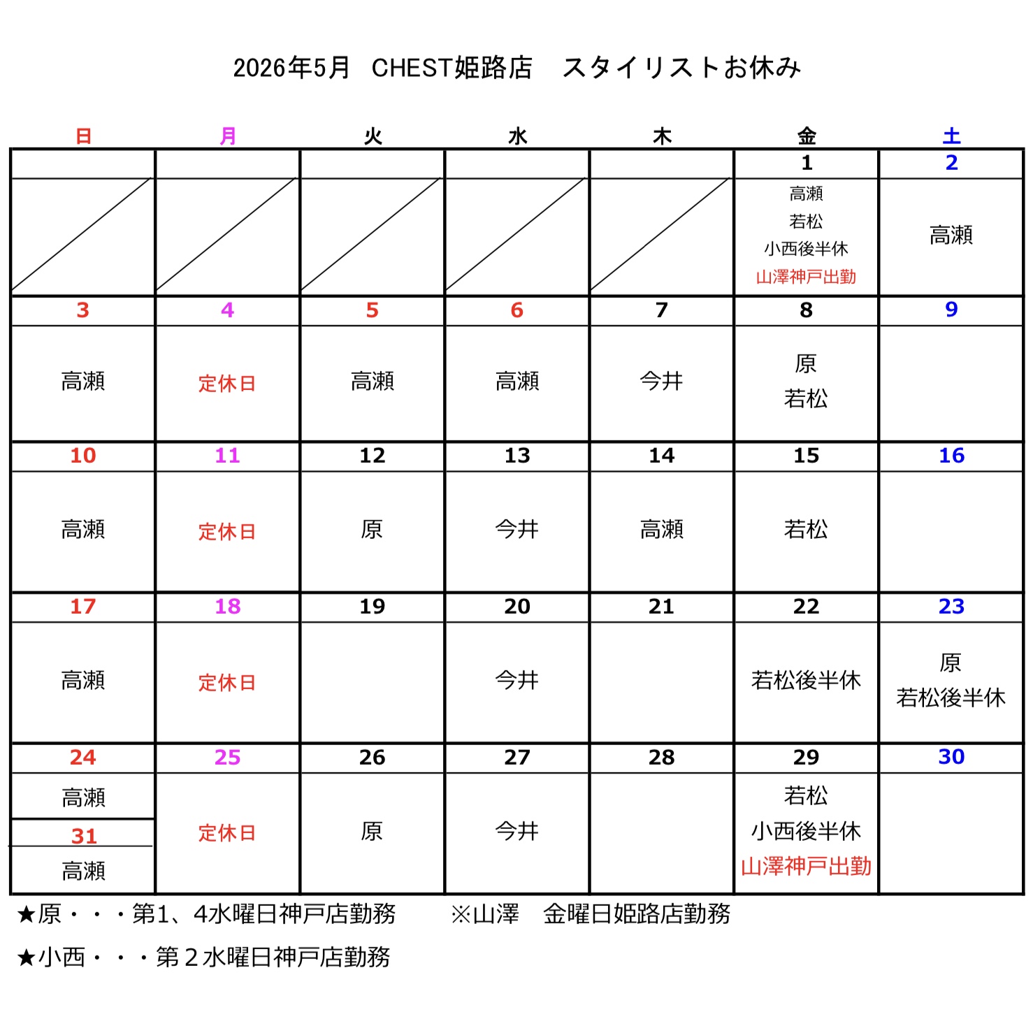 【CHEST神戸店・姫路店】5月のお休み