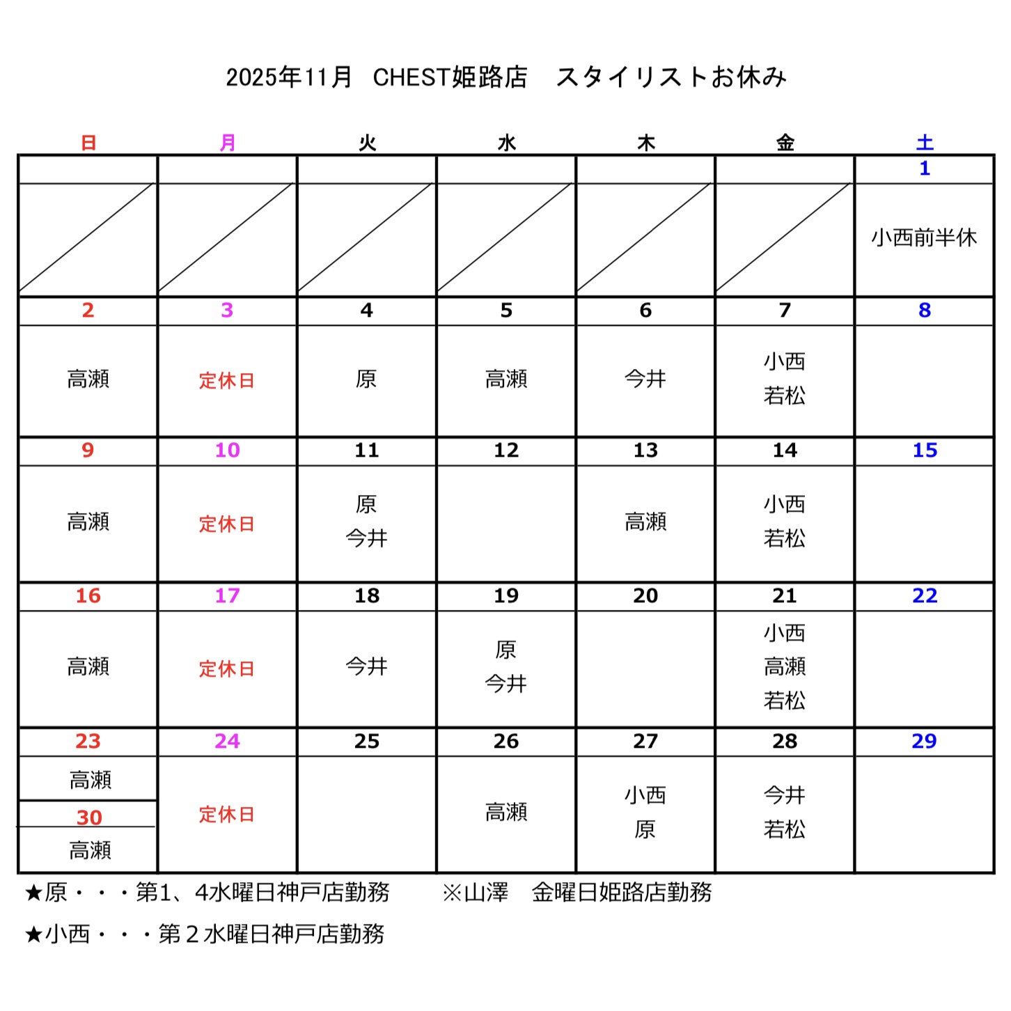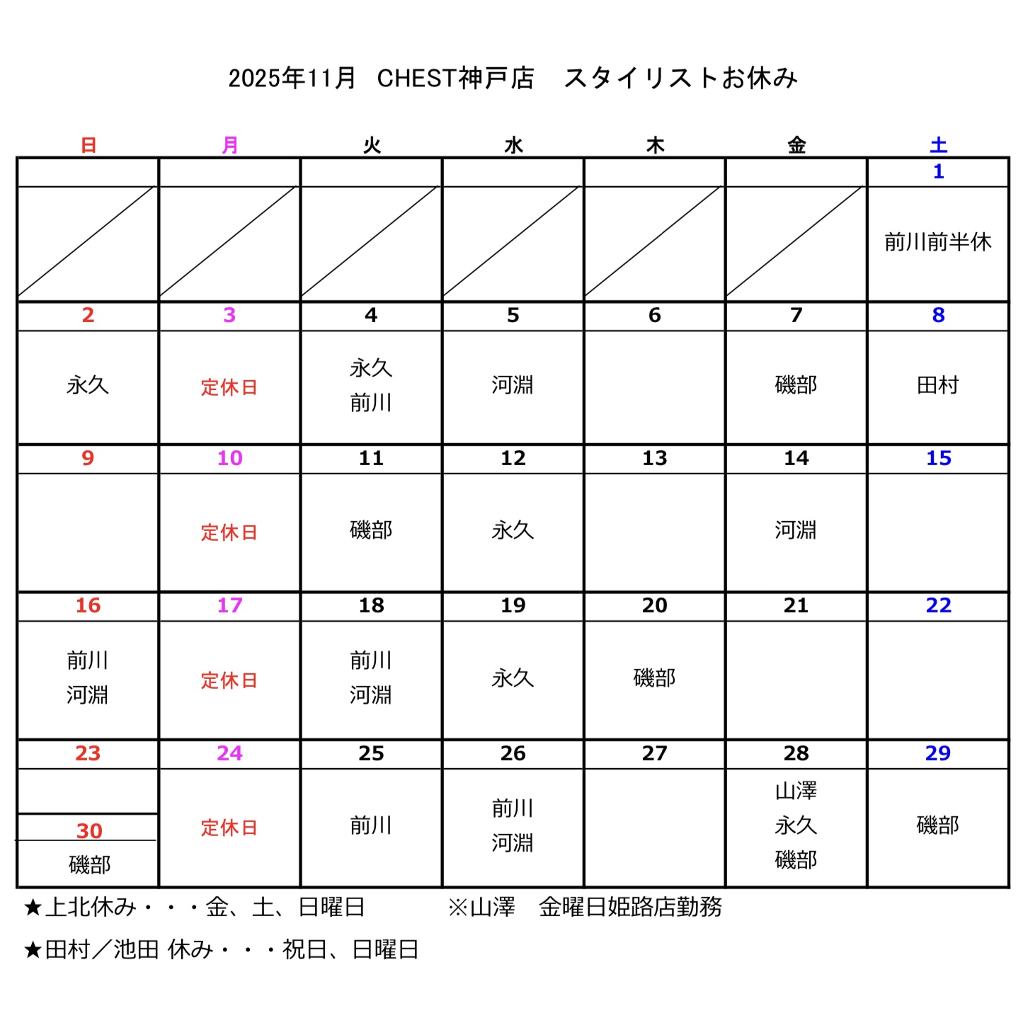 CHEST神戸店、CHEST姫路店の11月のお休みをお知らせいたします。